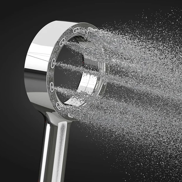As soon as the water starts running, a large volume of air is pulled through the inner circle of the shower head, pushing the spray of water more quickly towards the user. This increased spray force results in a sensational showering experience. The powerful X Jet streams provide an all-directional spray pattern, giving the user full water coverage during showering. Such a feeling and spray sensation cannot be realised using a conventional shower. A conventional shower always has undirectional streams, resulting in a loss of spray force. The X Jet design bundles the water, accelerates it, and distributes it evenly onto every part of your body and mind.