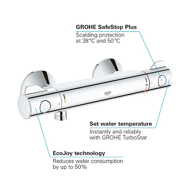 This Grohtherm 800 Thermostatic Shower Mixer is safe and ergonomic and great value for money. It benefits from GROHE TurboStat® technology, your water temperature stays constant, regardless of any fluctuations in your water supply or water pressure. The easy to grip controls can always be adjusted effortlessly, even with soapy hands. The integrated SafeStop Plus system comes with a two-stage temperature limit. The first limit is preset at 38°C. If desired, temperatures of up to 50°C can be selected upon deactivating the SafeStop button. With GROHE EcoJoy® technology, you can indulge in a perfectly comfortable shower while reducing water consumption.
