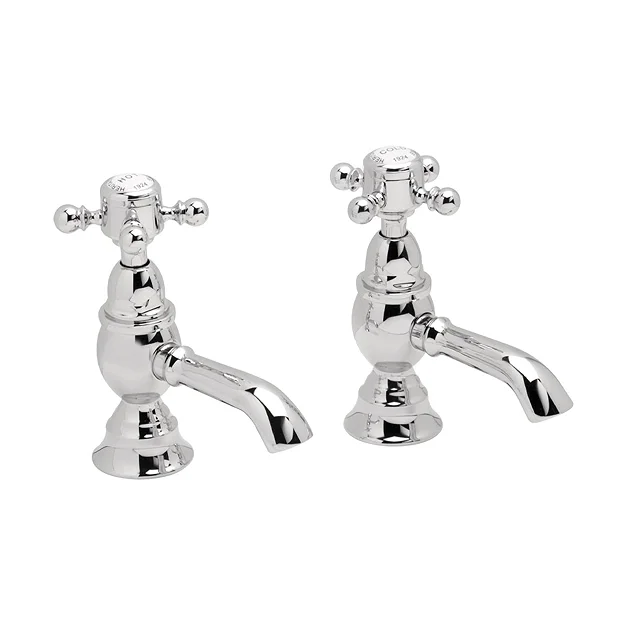 The Heritage Hartlebury Basin Pillar Taps display classic elegance with a modern twist. Its brass construction and chrome finish make these taps a great addition to any period themed bathroom. Features quarter turn ceramic disc valves and a longer spout that is ideal for use with no taphole inset basins.