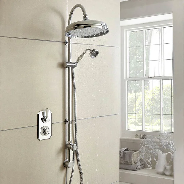 This Hudson Reed Topaz Traditional Concealed Thermostatic Valve will compliment any period bathroom suite, offers thermostatic showering via two easy-to-operate controls for temperature and flow. Supplied with a luxury rigid riser with Concealed Elbow which features a fixed 300mm diameter shower head on a curved arm, an additional shower handset and a concealed elbow.