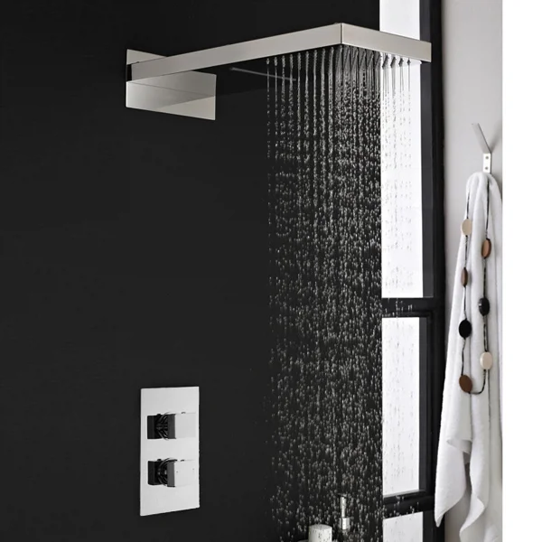 This Milan minimalist concealed thermostatic shower valve package compliments any modern bathroom suite, offers a flexible shower solution with a neat finish. Pipework is concealed for a minimalist look. Includes a shower valve which diverts controls the two functions ‘Rain effect or waterfall effect’ on the shower head. Easy to operate controls – the Top control is the diverter to switch between shower head functions, the bottom control adjusts the temperature.