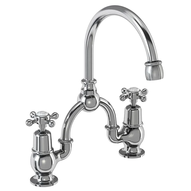 The Burlington Claremont 2 Tap Hole Bridge Curved Spout Basin Mixer (200mm centers) with Plug & Chain, create the perfect period bathroom with our range of quality chrome plated traditional taps. Comes with a 15 year guarantee. All claremont taps have a four spindle tap head with a ceramic indice in the centre.