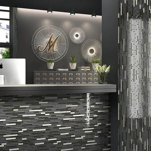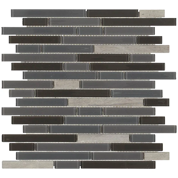 The Brooklyn mosaic tile sheet features small but luxurious satin glass and stone pieces in shimmering shades of grey. This striking mosaic tile celebrates the unique beauty of natural stone to offer a timeless look and feel to any room.