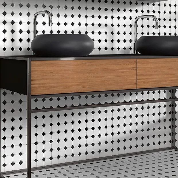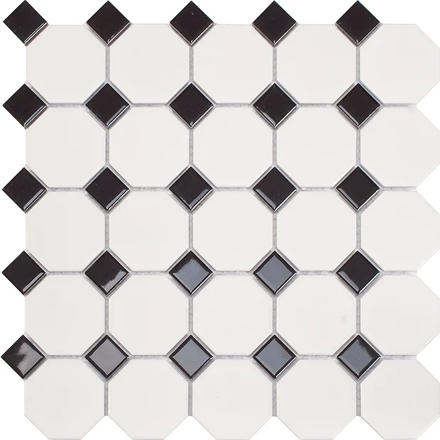 Add character to your kitchen or bathroom with the Haywood black and white mosaic tiles. It’s striking design can be used on walls or floors. Made from durable porcelain, these attractive tiles have a mixed finish.